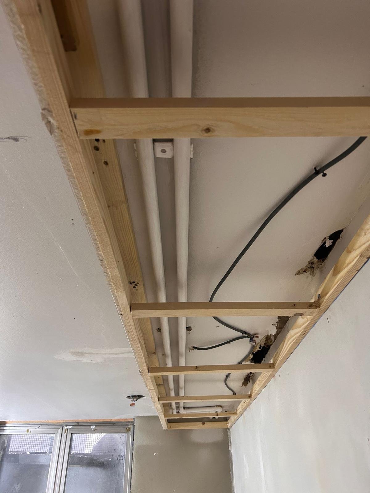 Réalisation d’une ossature en bois sur mesure pour cacher des tuyaux et câbles apparents. Cette solution, à la fois technique et esthétique, garantit un rendu propre, sécurisé et harmonieux dans la pièce. C’est une étape essentielle pour donner un aspect final net et professionnel après des travaux de gros œuvre.